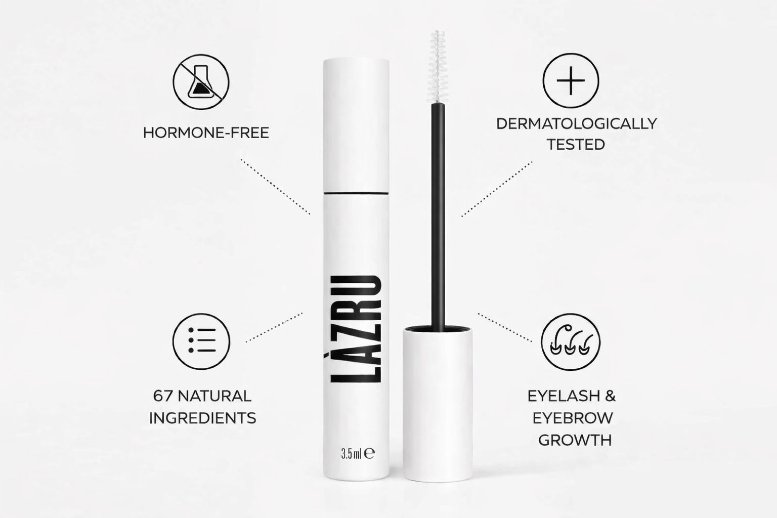 Lazru je razvijen za ljude koji ne žele samo vizualno prikriti kratke, slabe ili rijetke trepavice i obrve, već i ciljano potaknuti njihov rast. Formula koja sadrži Procapil™ i AnaGain™ djeluje izravno na korijen i posebno je osmišljena za poticanje rasta trepavica i obrva.
